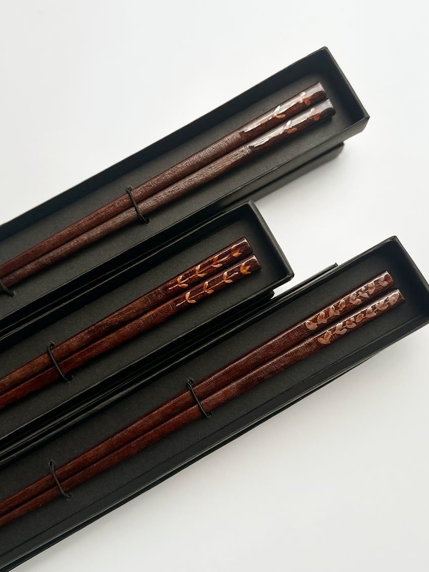 一つ一つ手塗りで仕上げた漆のお箸。 木々がゆらぐ木漏れ日の"光の粒"をイメージした蒔絵が施されています。作品箱付で、プレゼントにもおすすめです。