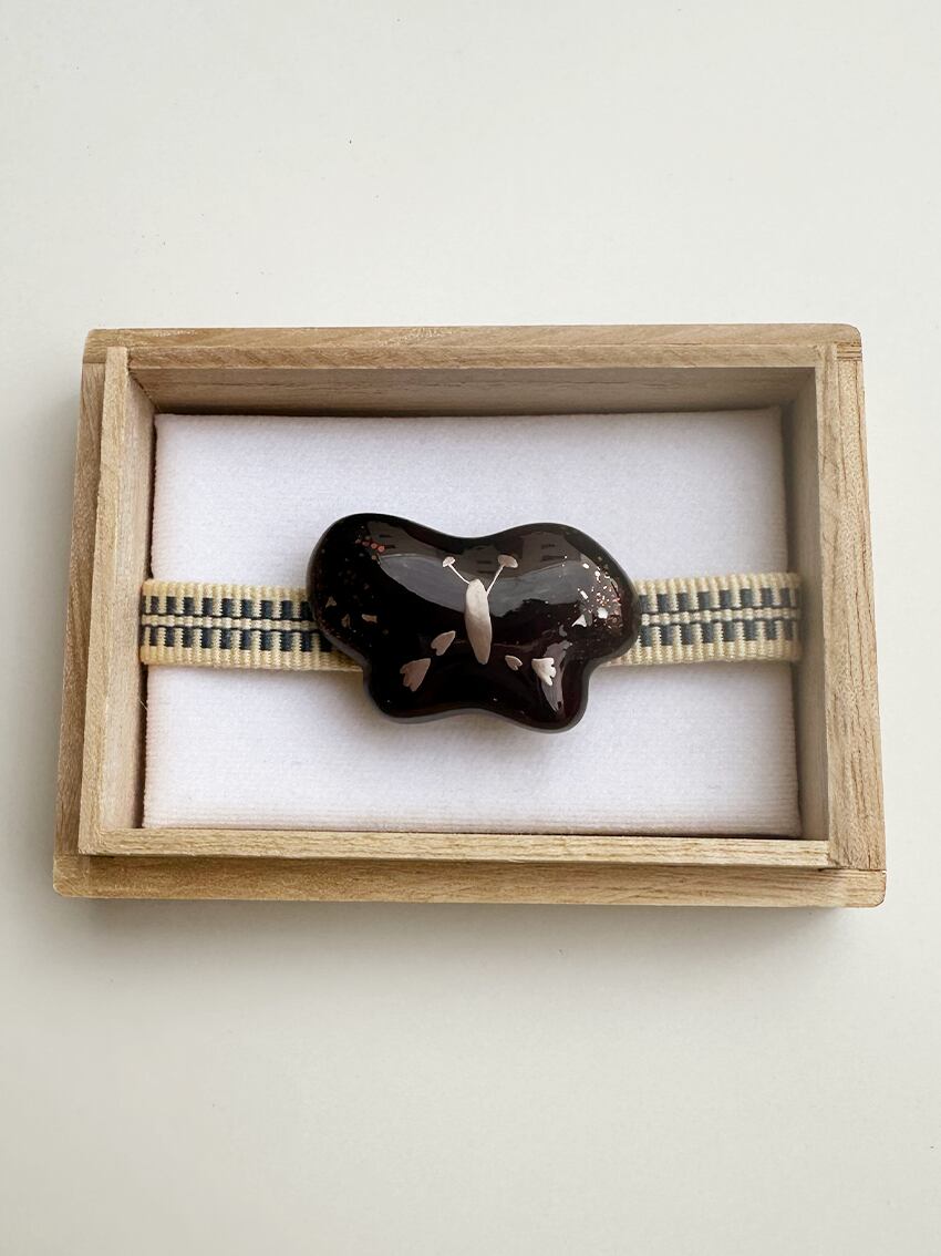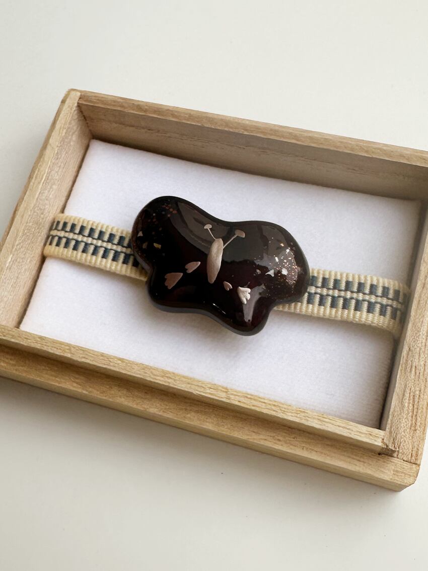 木地の形から一つ一つ削り出し、丁寧に漆で仕上げられた帯留です。