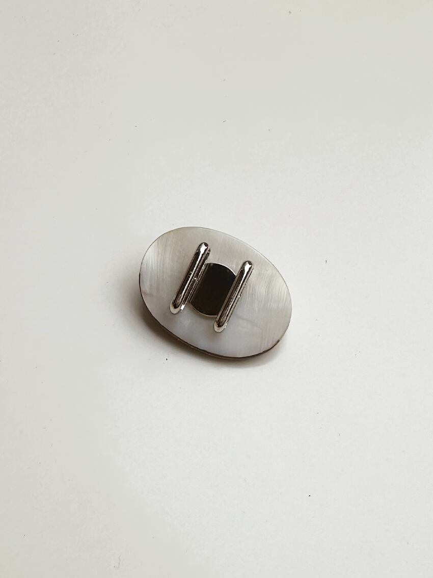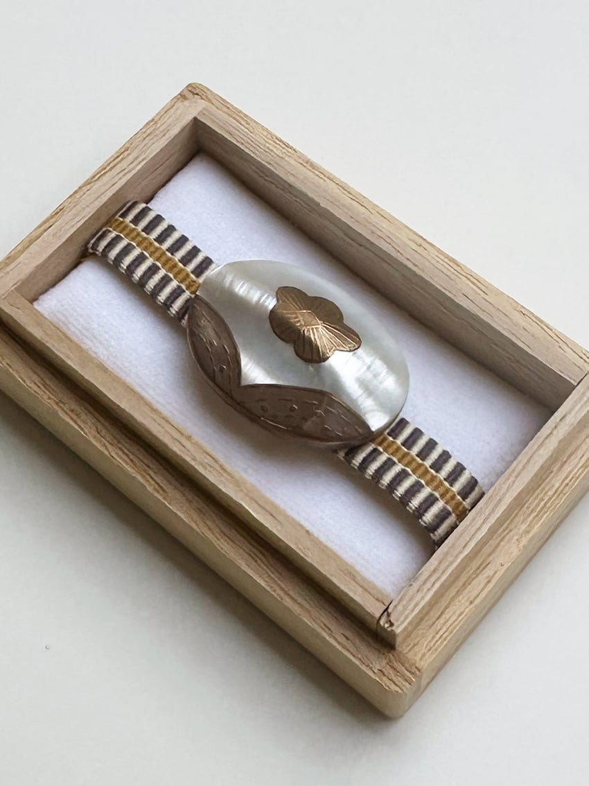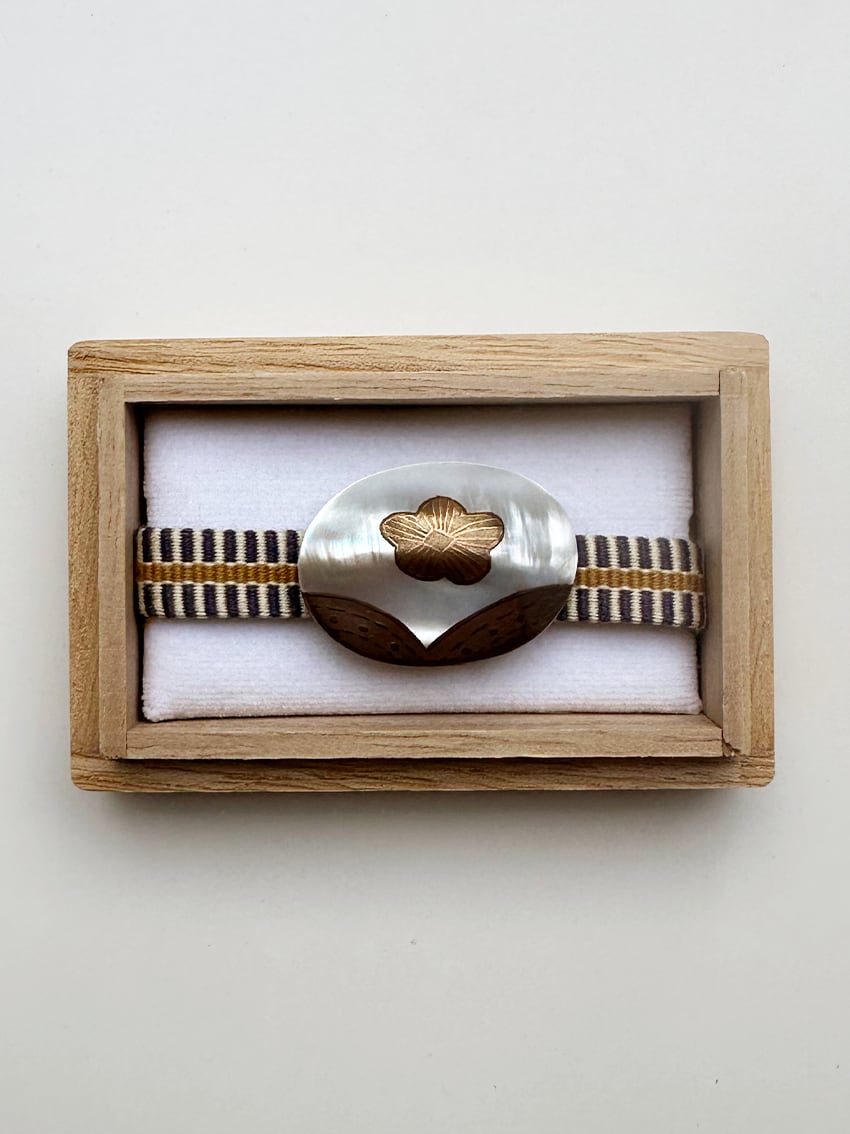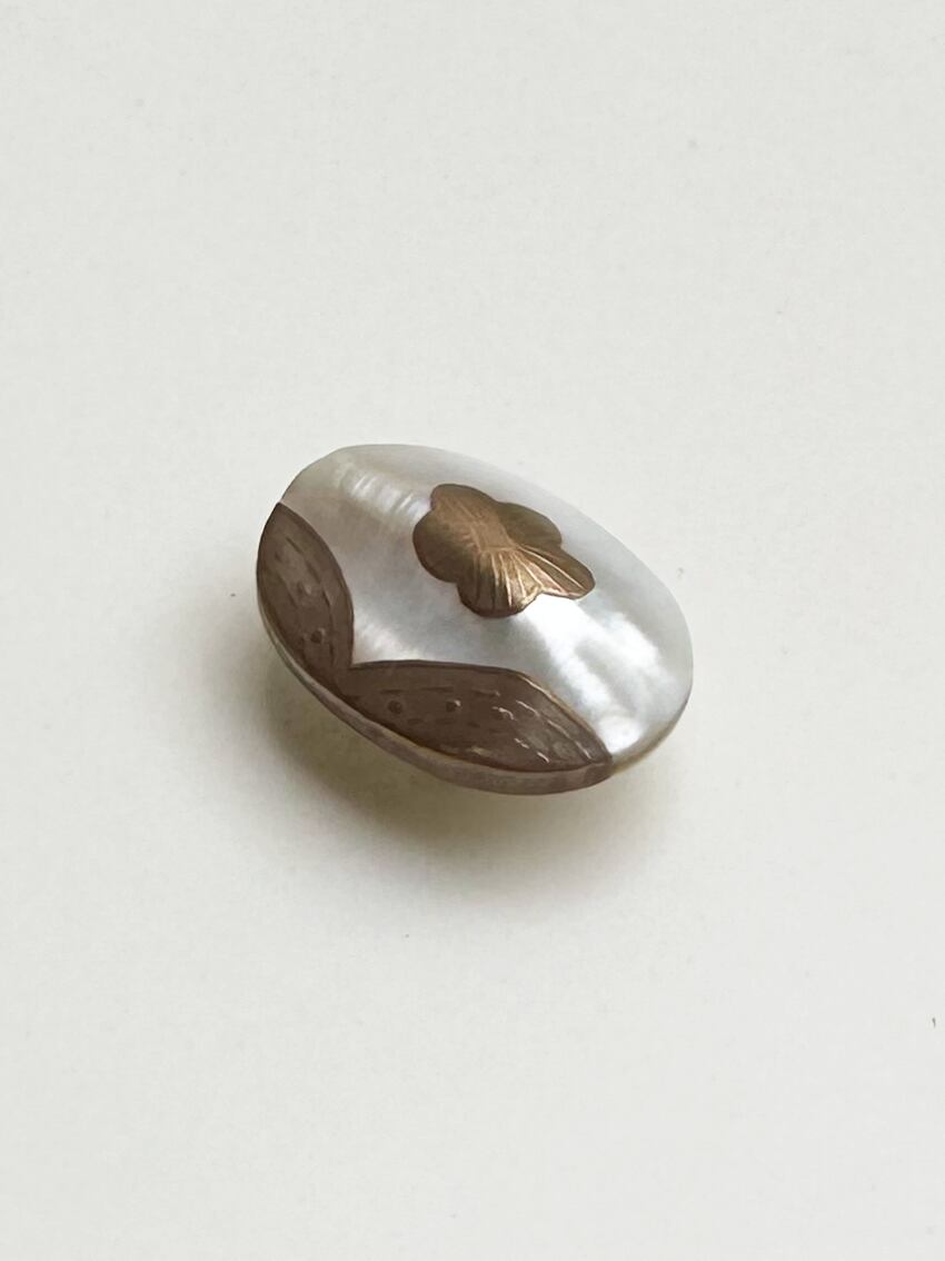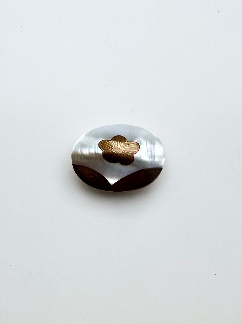 貝を素地として、花模様の蒔絵が施された帯留です。